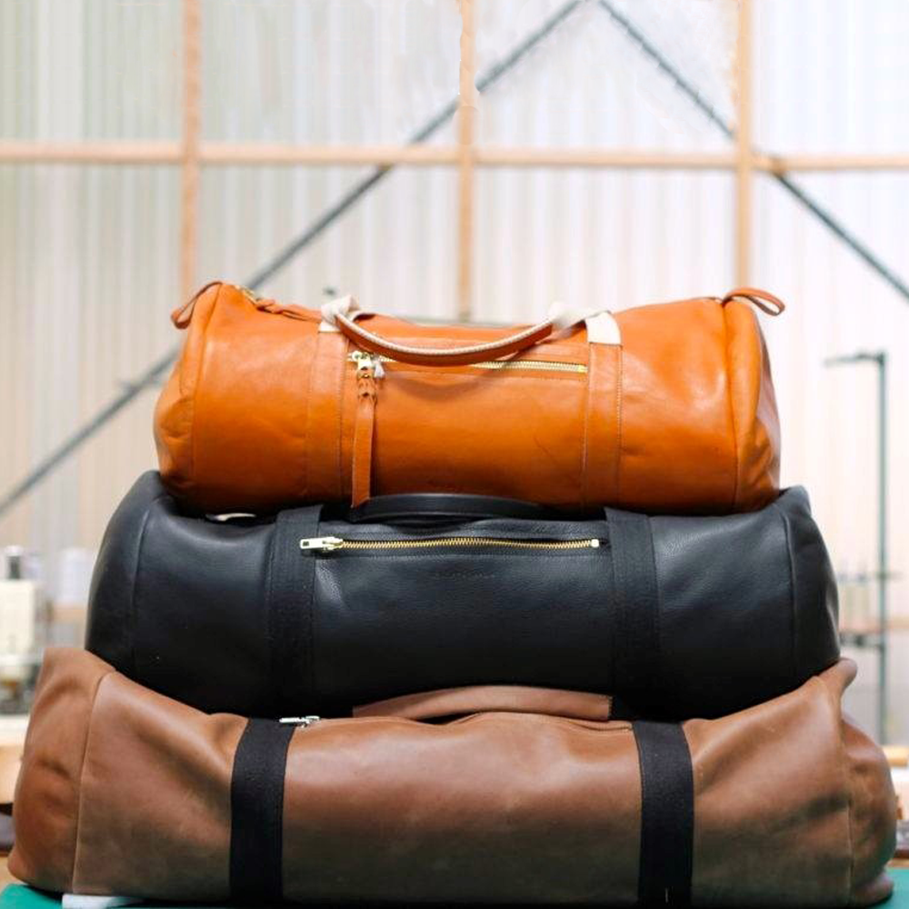 Round molded ends, brass zippers, floating outside pocket which can slip over suitcase handle, one inside pocket.
