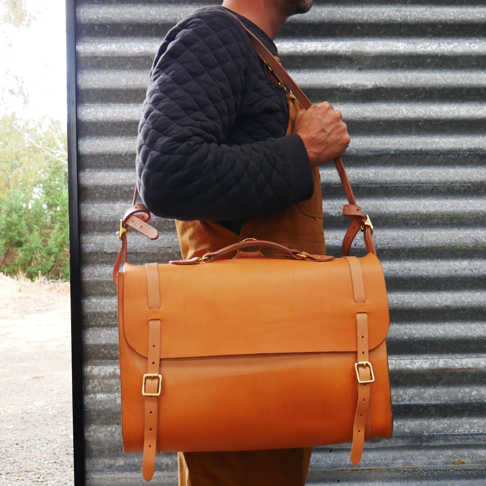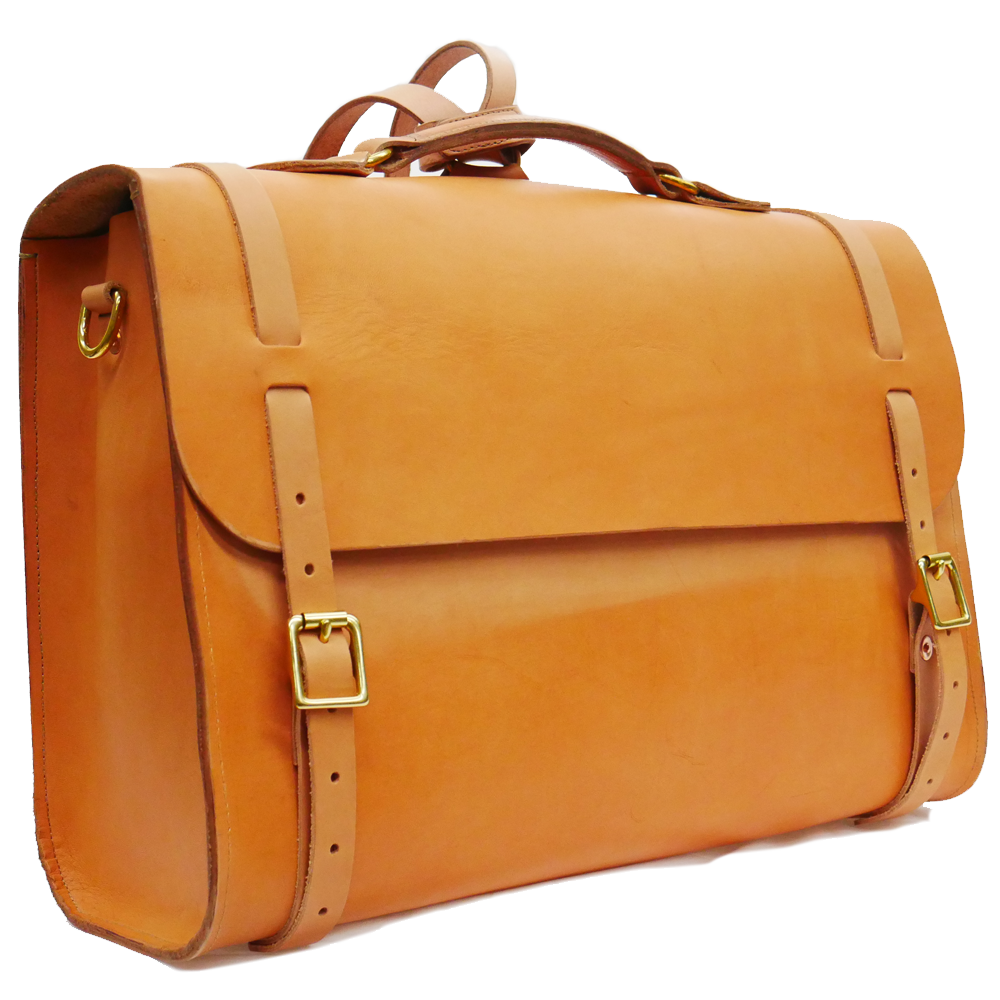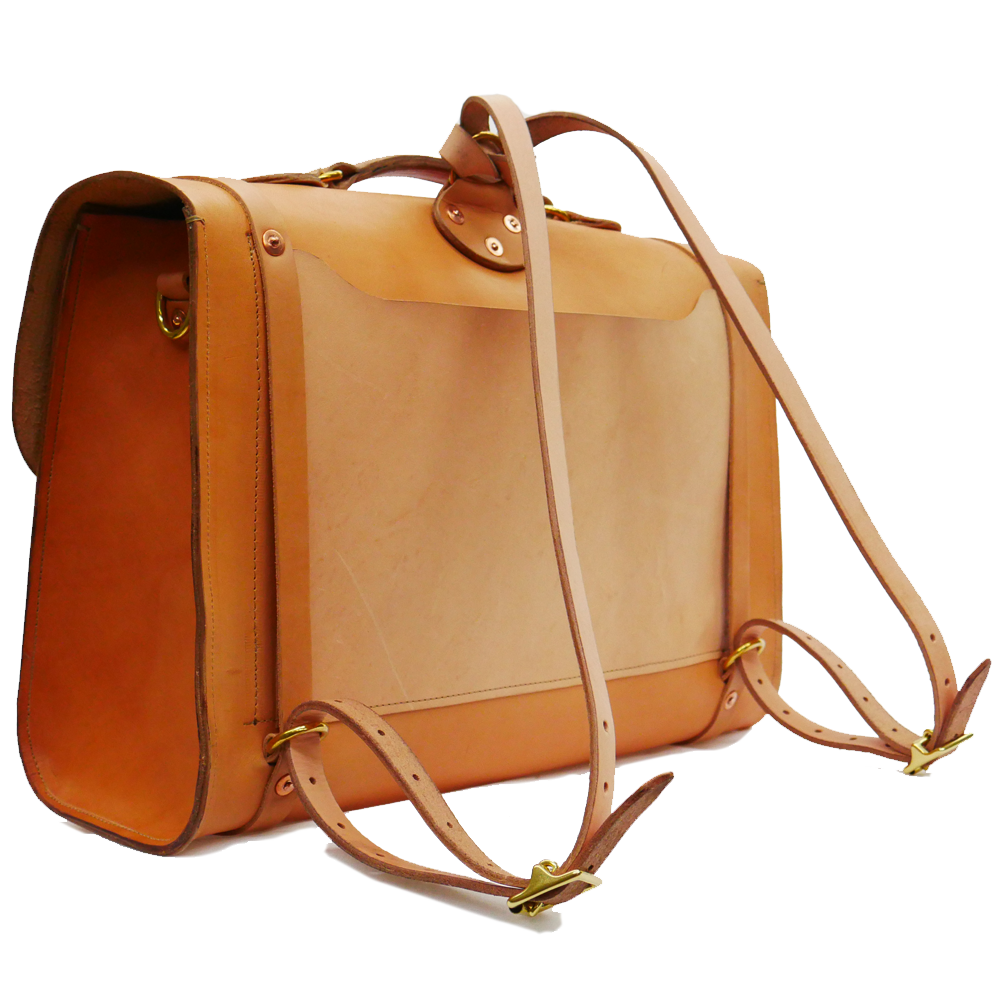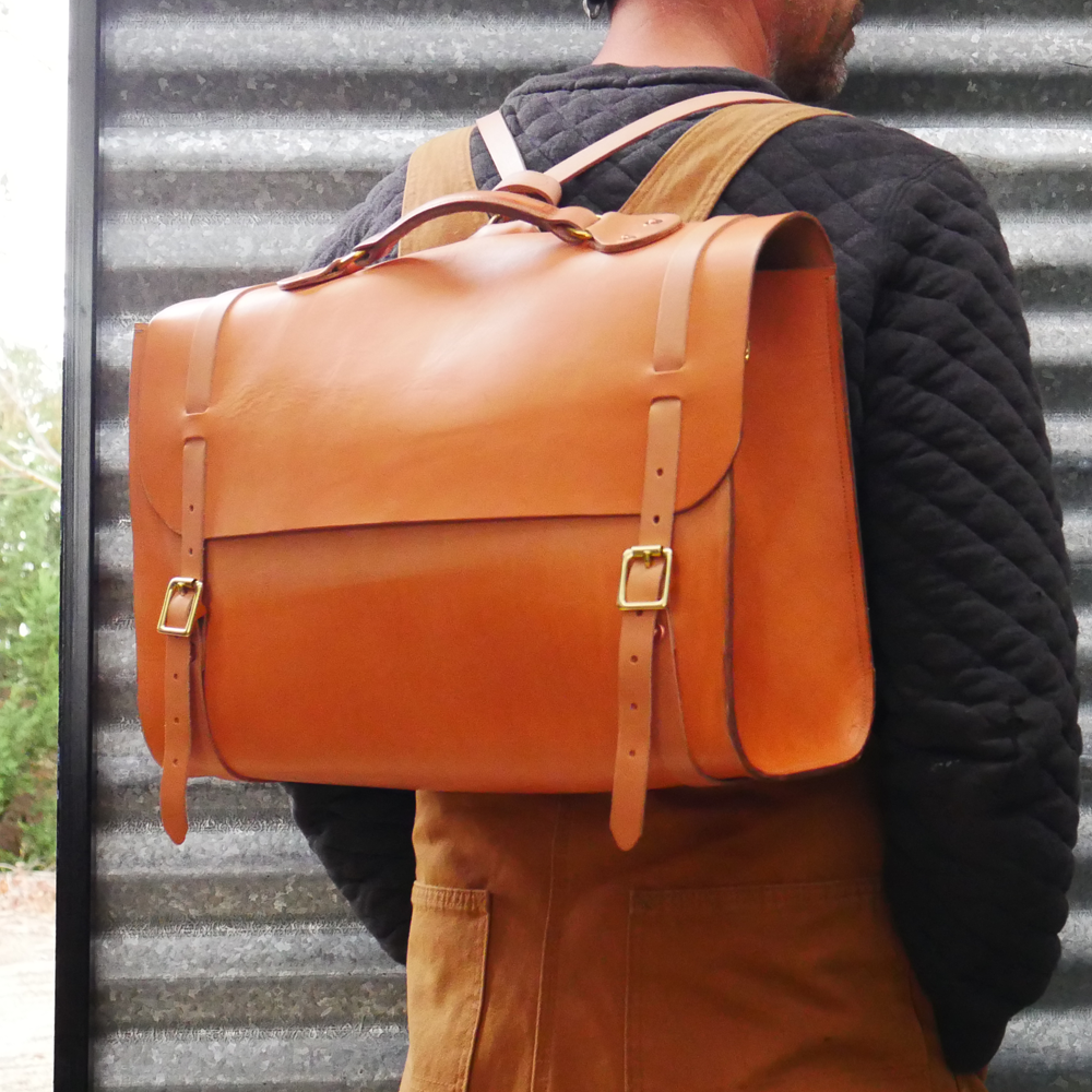 Made from full grain vegetable tan leather with a single panel main body. All straps are adjustable and secured with solid brass buckles and hand beaten solid copper rivets.