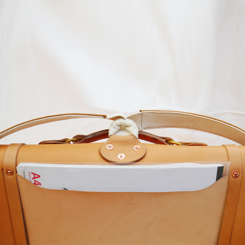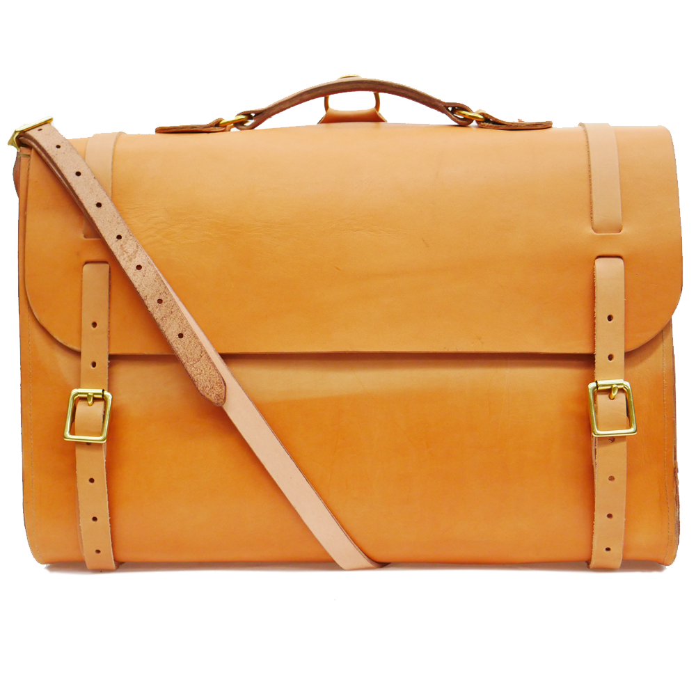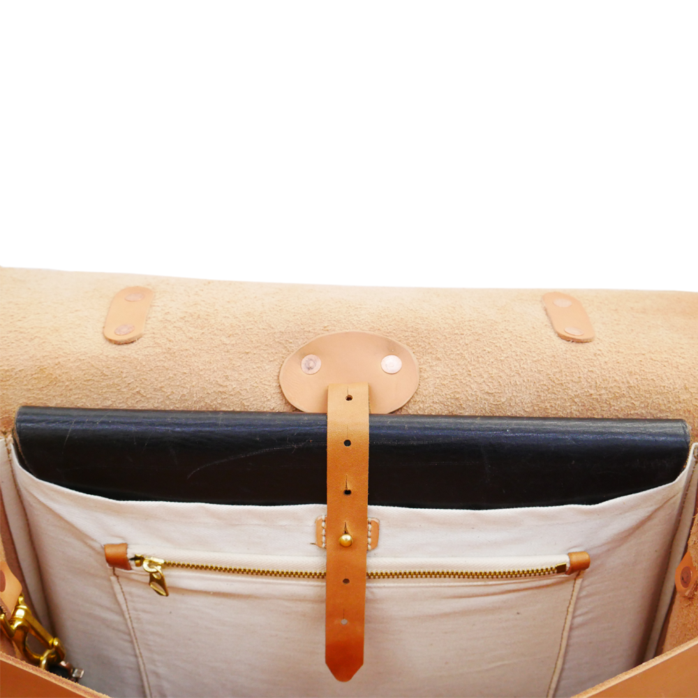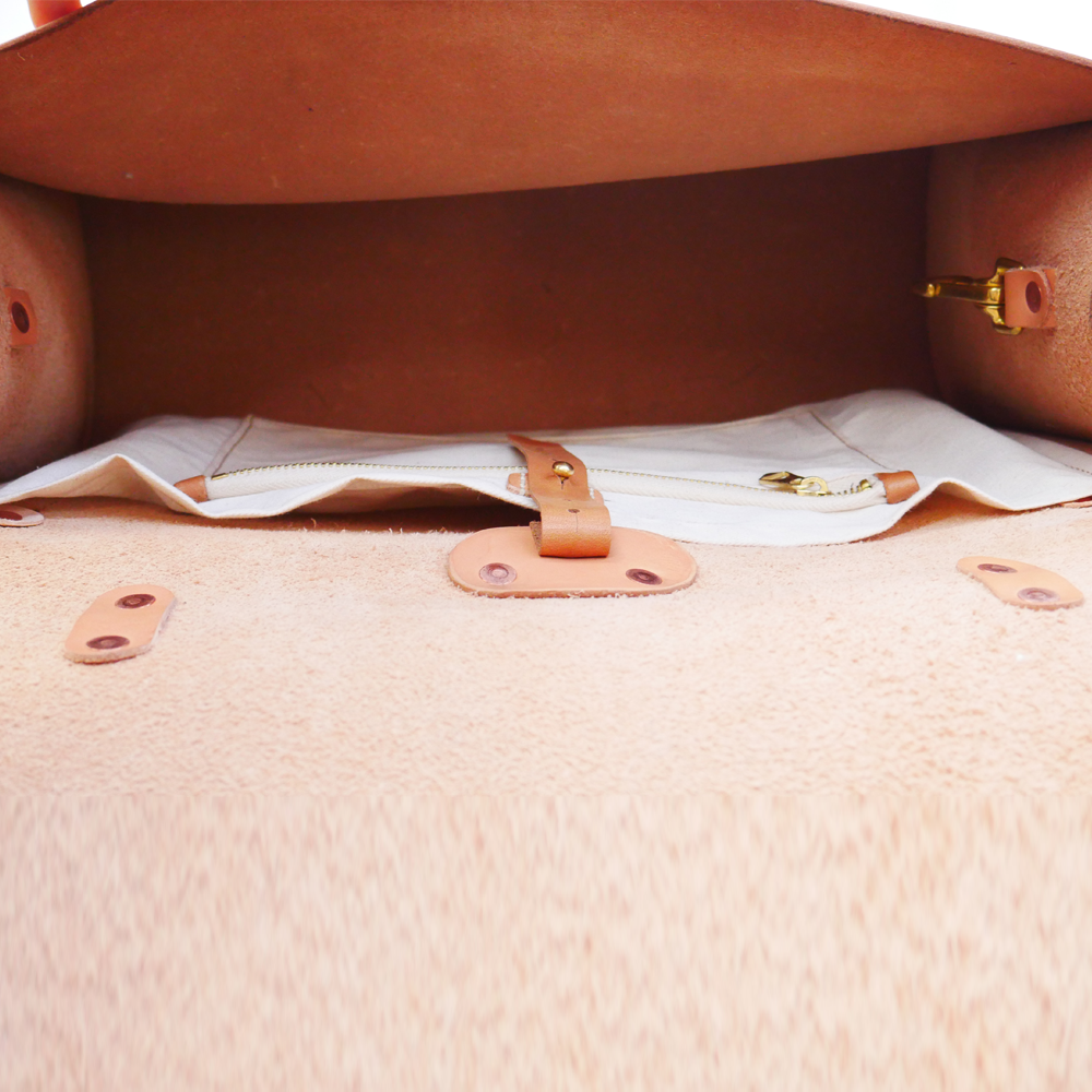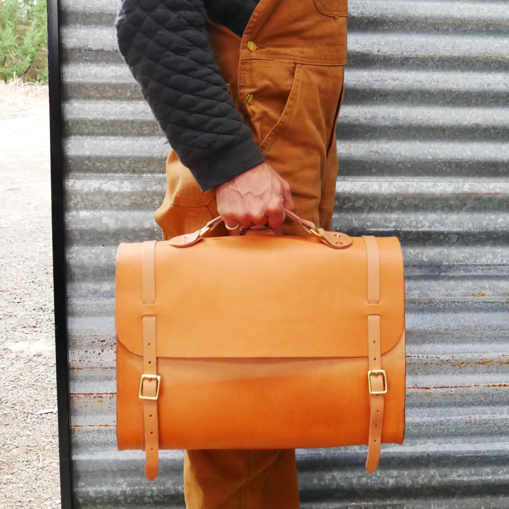 Made from full grain vegetable tan leather with a single panel main body. All straps are adjustable and secured with solid brass buckles and hand beaten solid copper rivets.