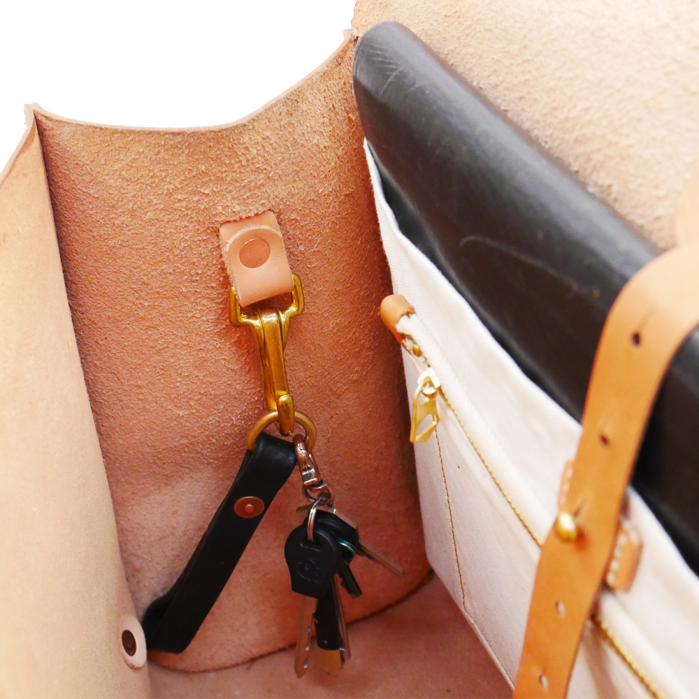 Inside is one zipper closure pocket and a laptop sleeve suitable for upto 13" models, with a fastening strap. Also one snap hook to secure your keys etc.
